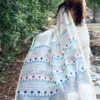 A perfect blend of art and sophistication, this Chaand Baug saree features a serene ivory base adorned with delicate lotus and dragonfly motifs across the body—symbolizing calm beauty and effortless movement. The pallu stands out with refined geometric patterns, adding a contemporary touch to its traditional soul.