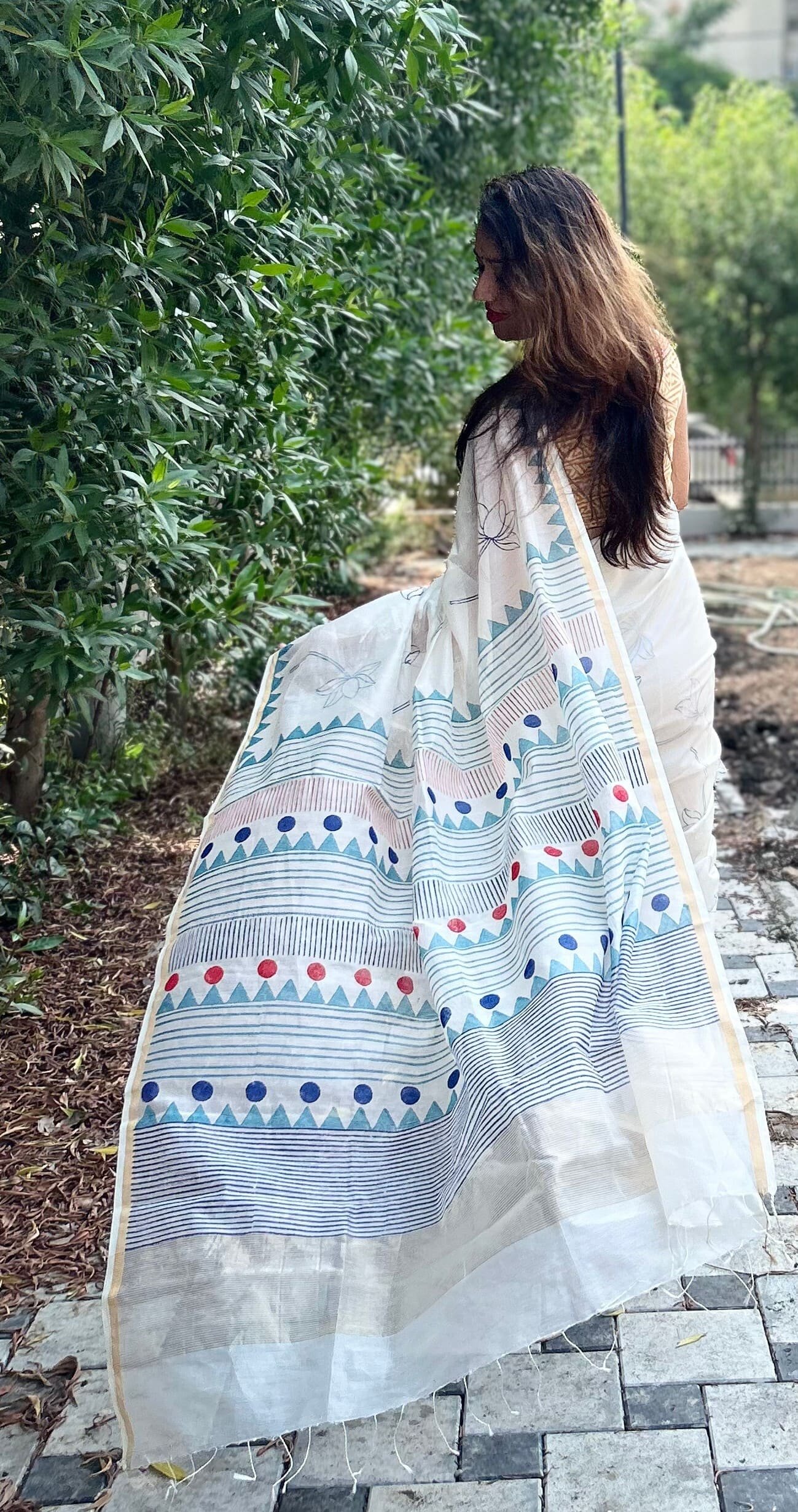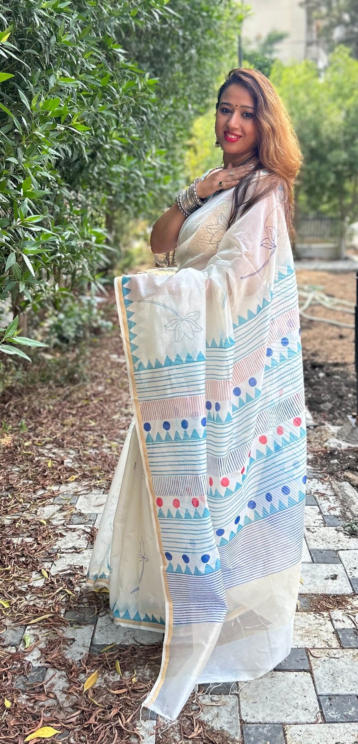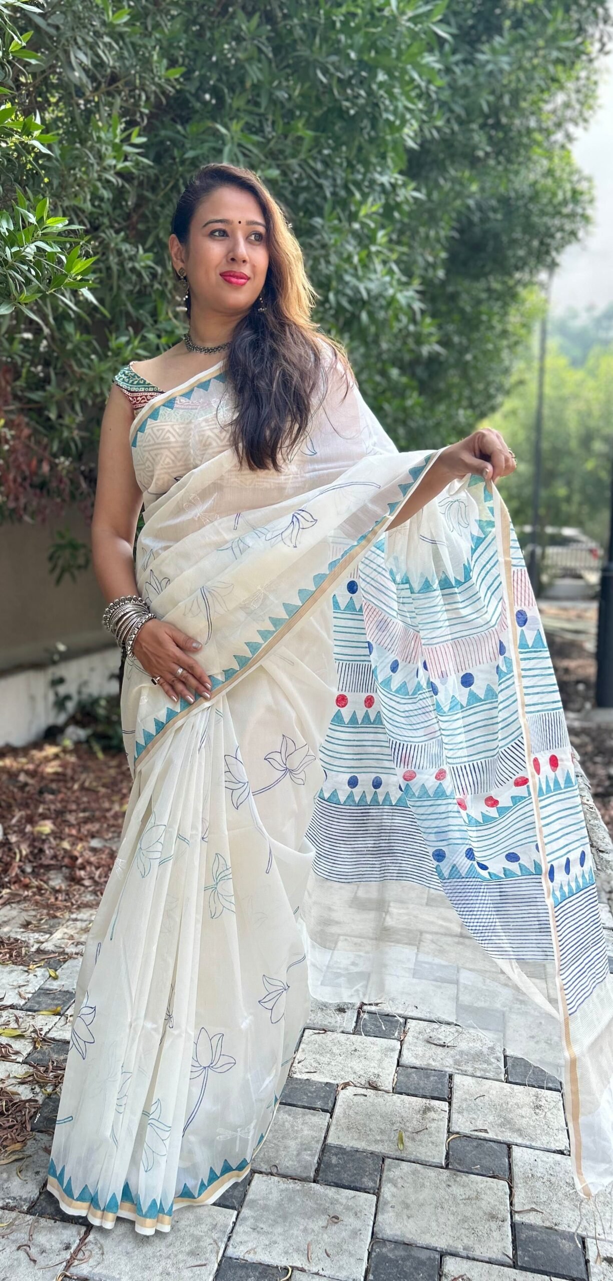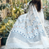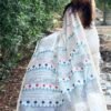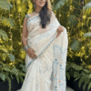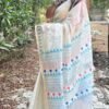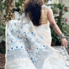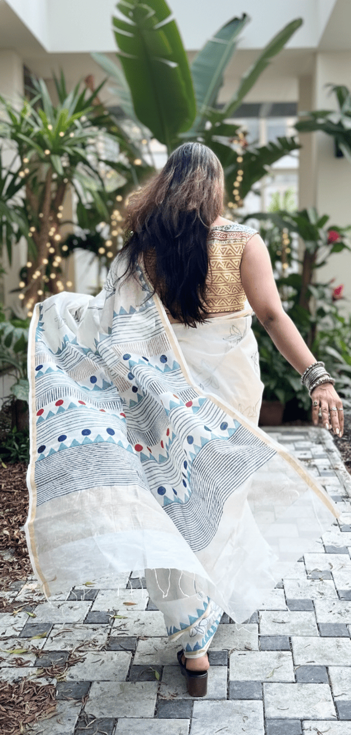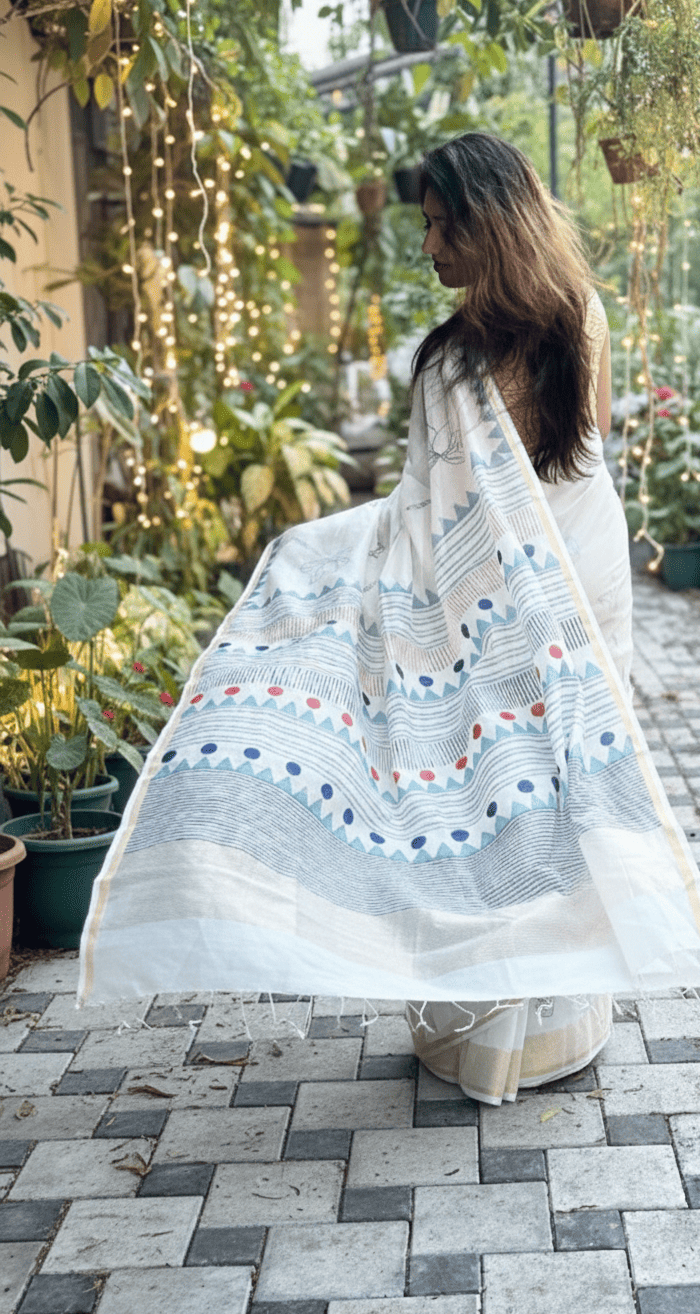 Off-white thin zari border, floral handprinted, and Handwoven Chanderi saree.