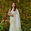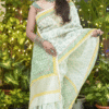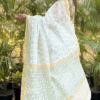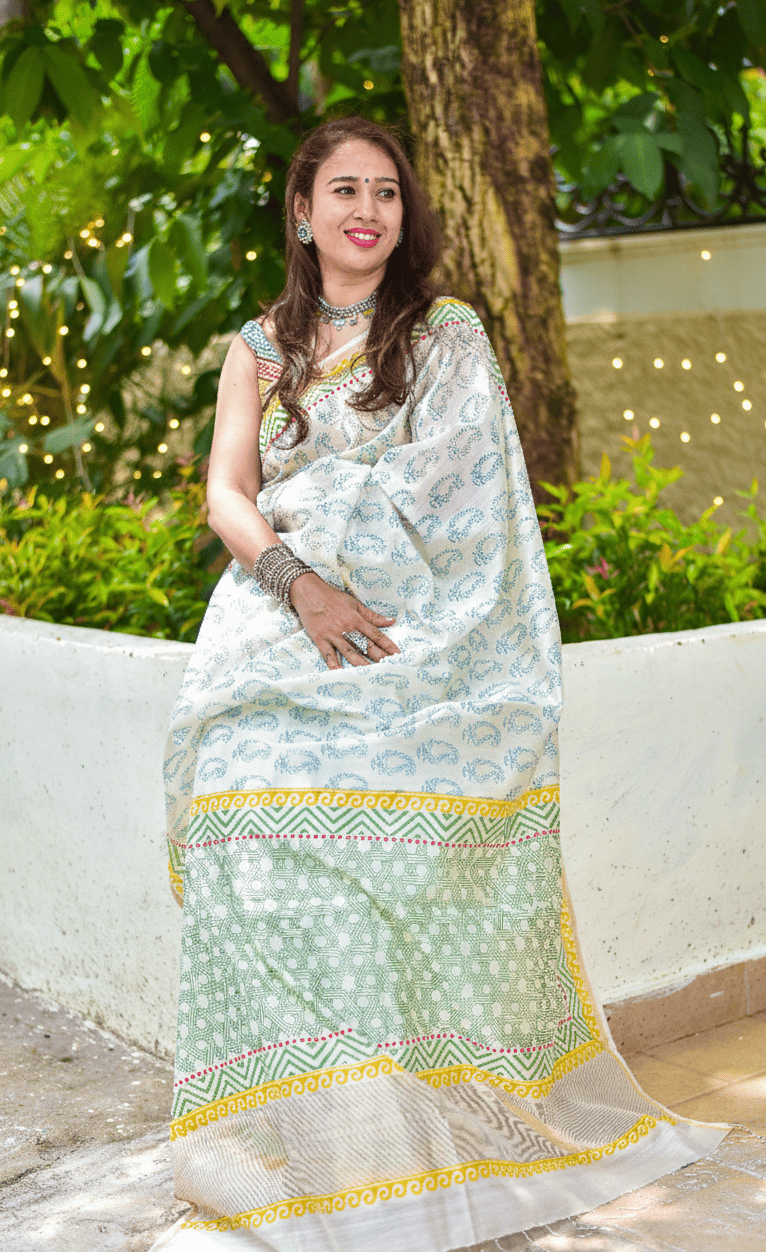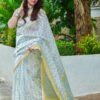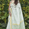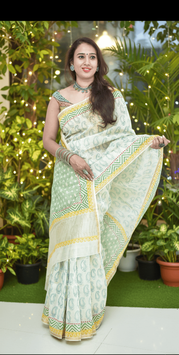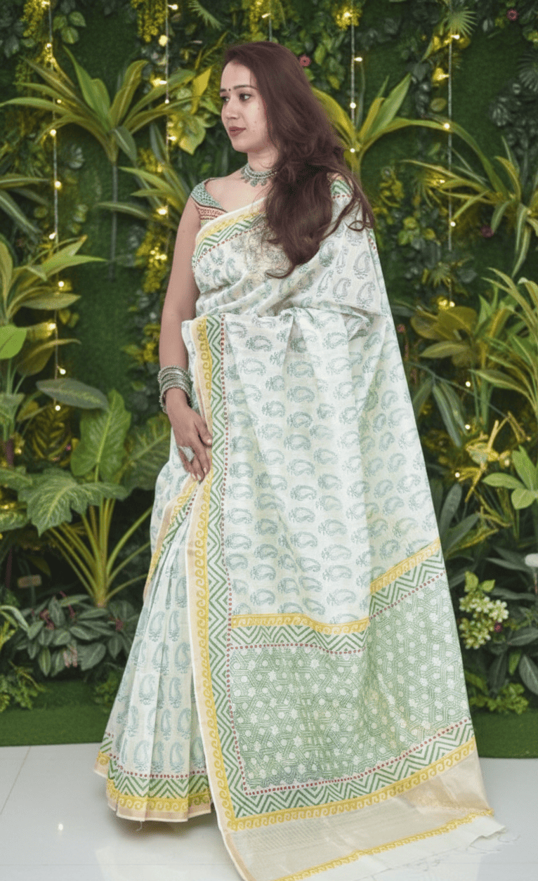 Off white thin zari border floral handprinted and Handwoven Chanderi saree.