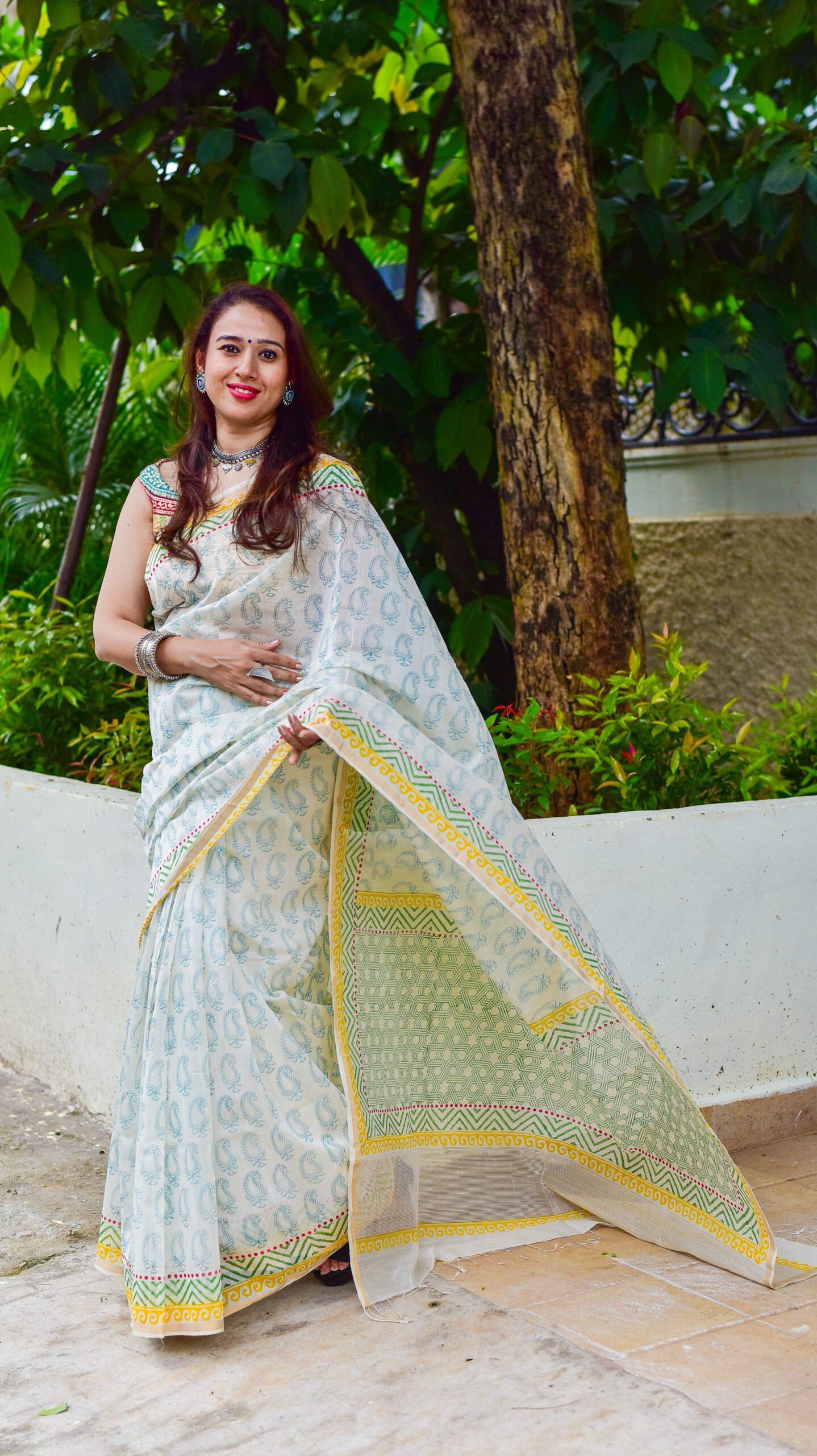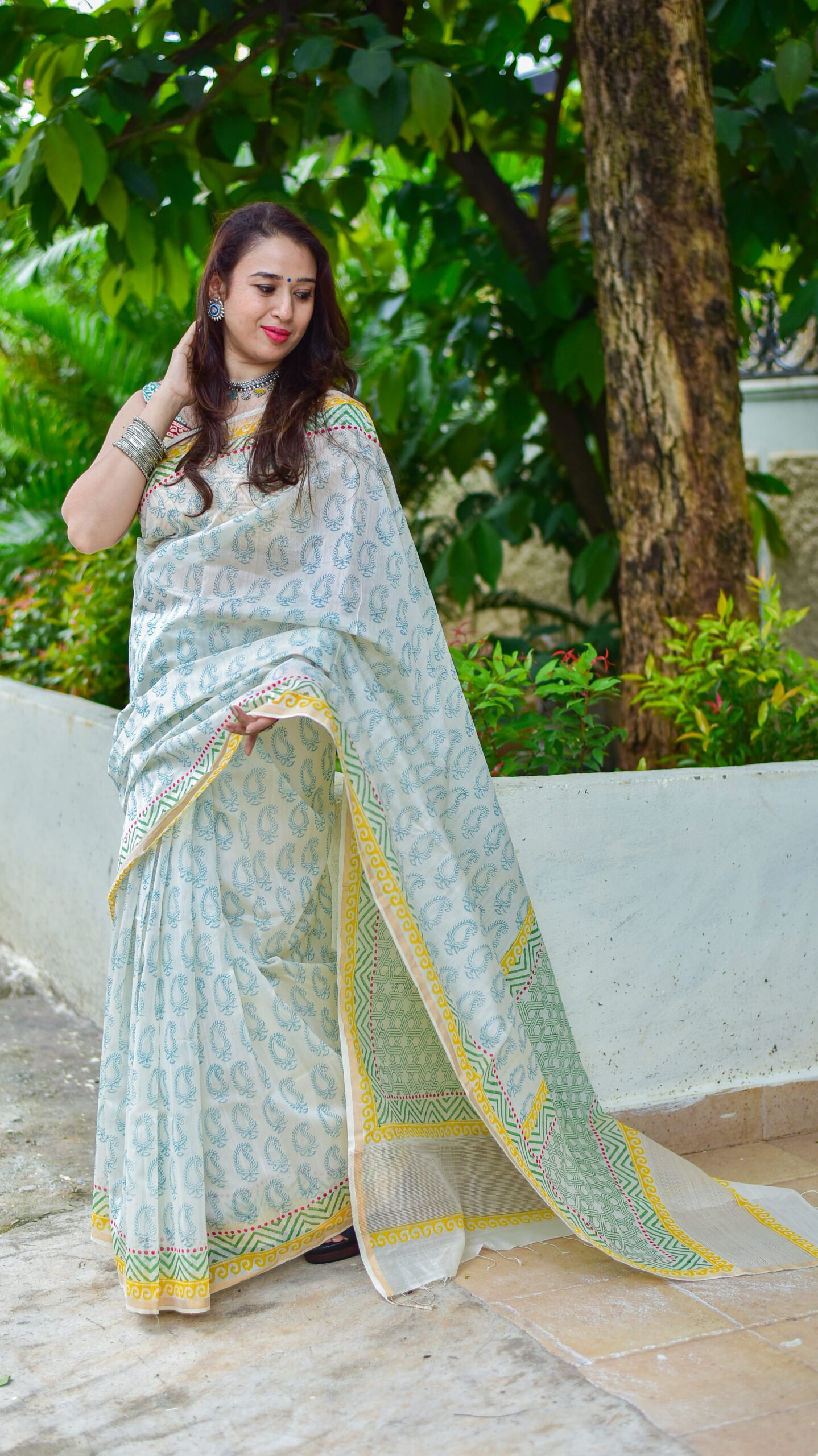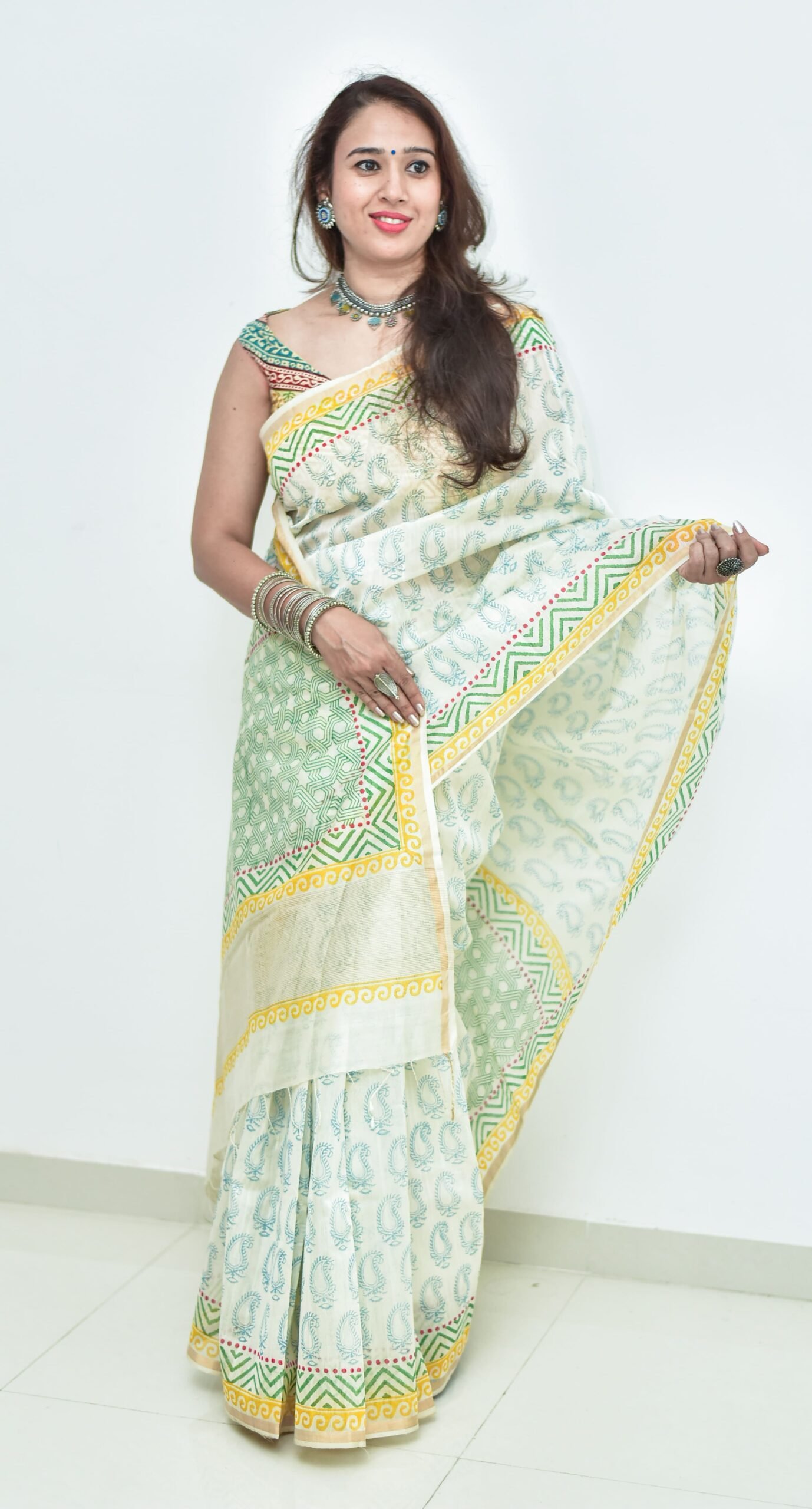 Off white thin zari border floral handprinted and Handwoven Chanderi saree.