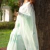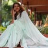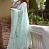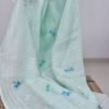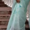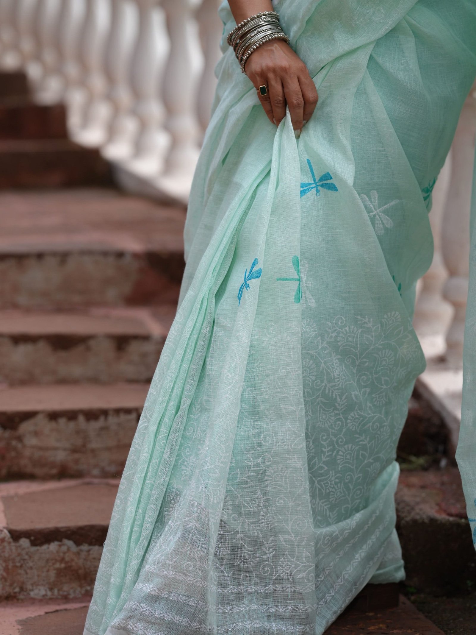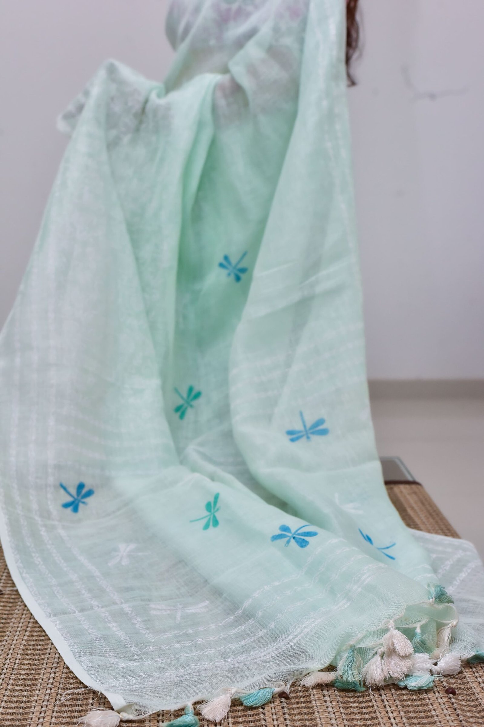 Light green linen by linen saree, handwoven saree with floral handprint.