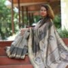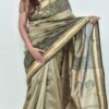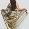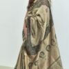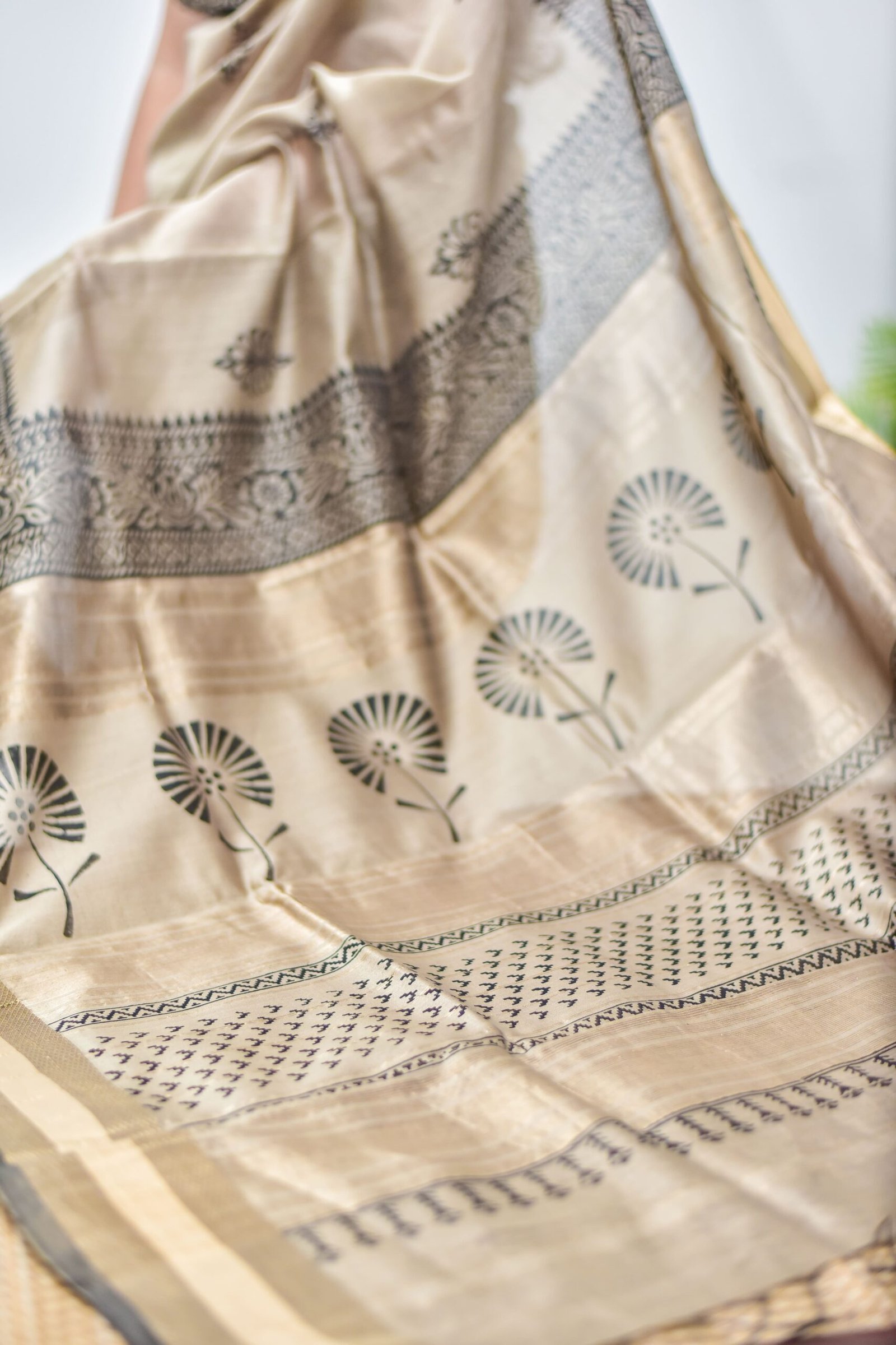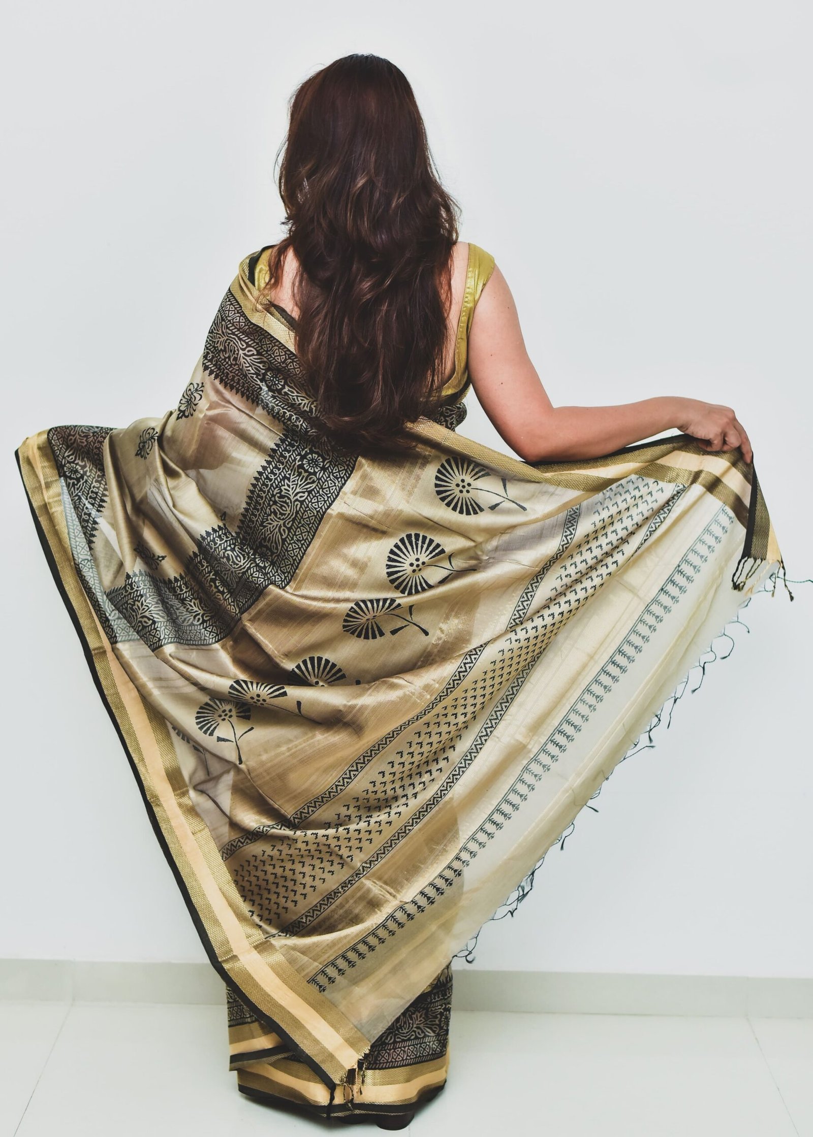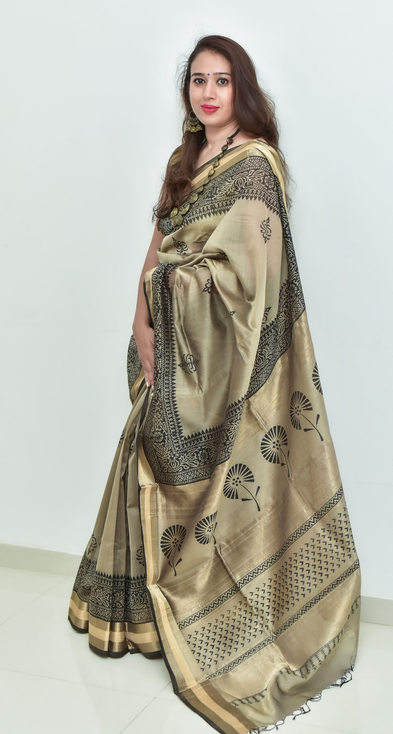 Taupe colour maheshwari handwoven Zari bordersaree with black buti handprint
