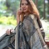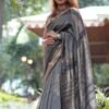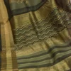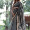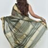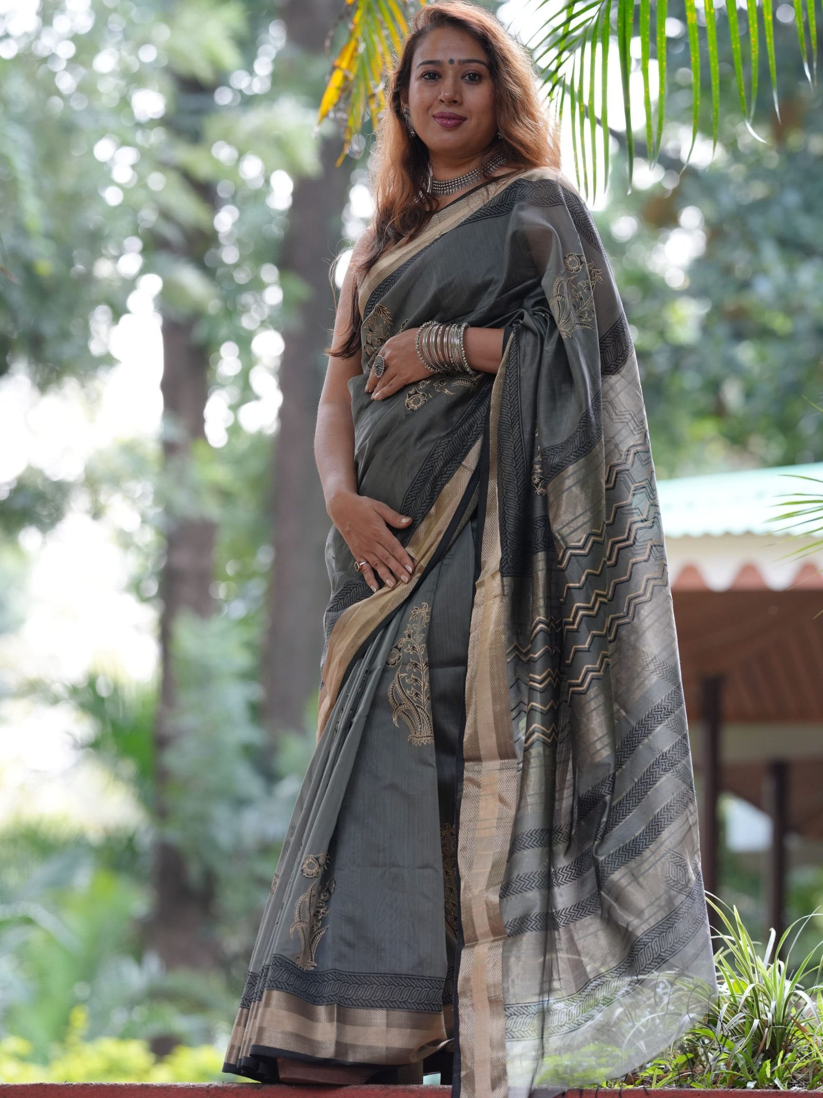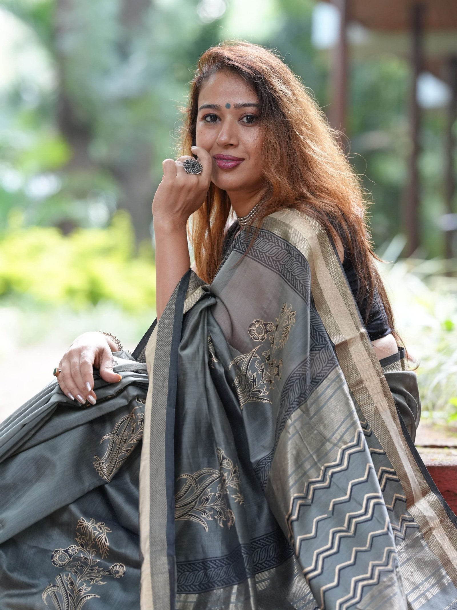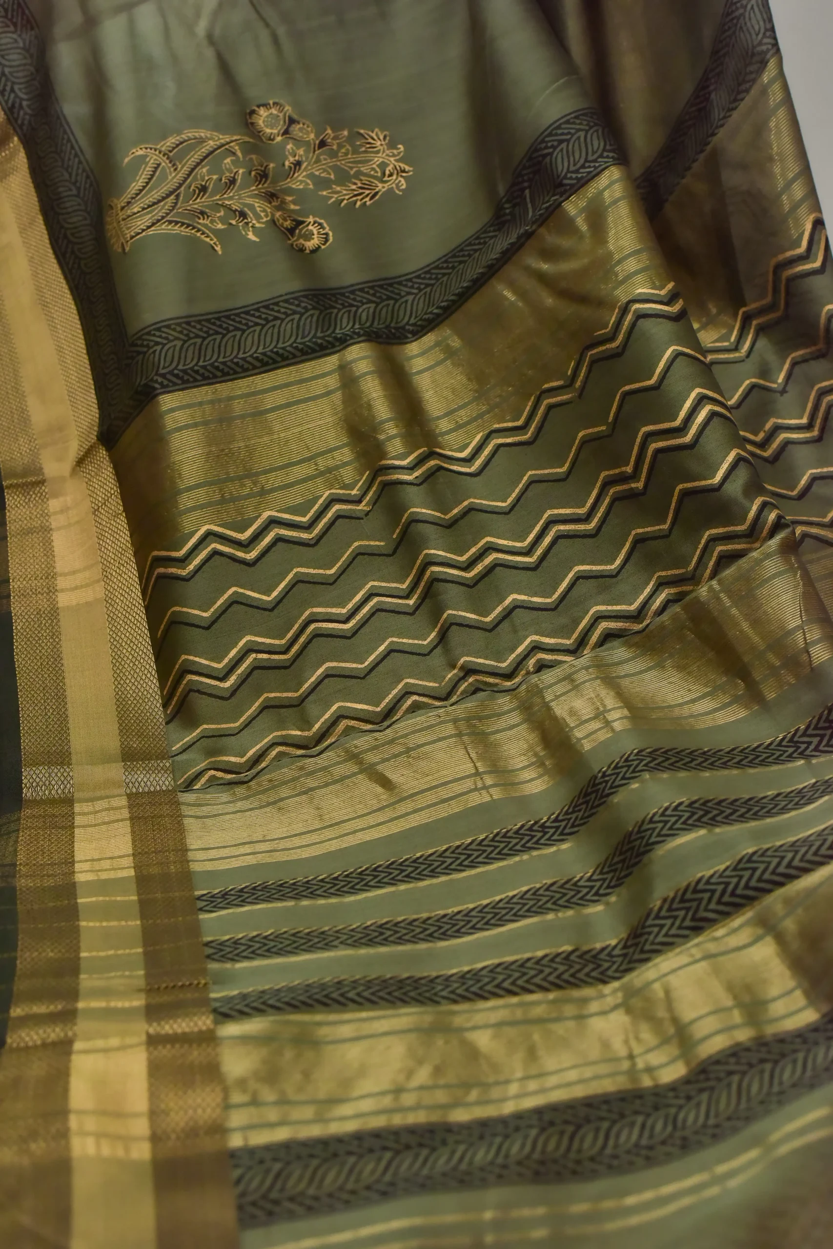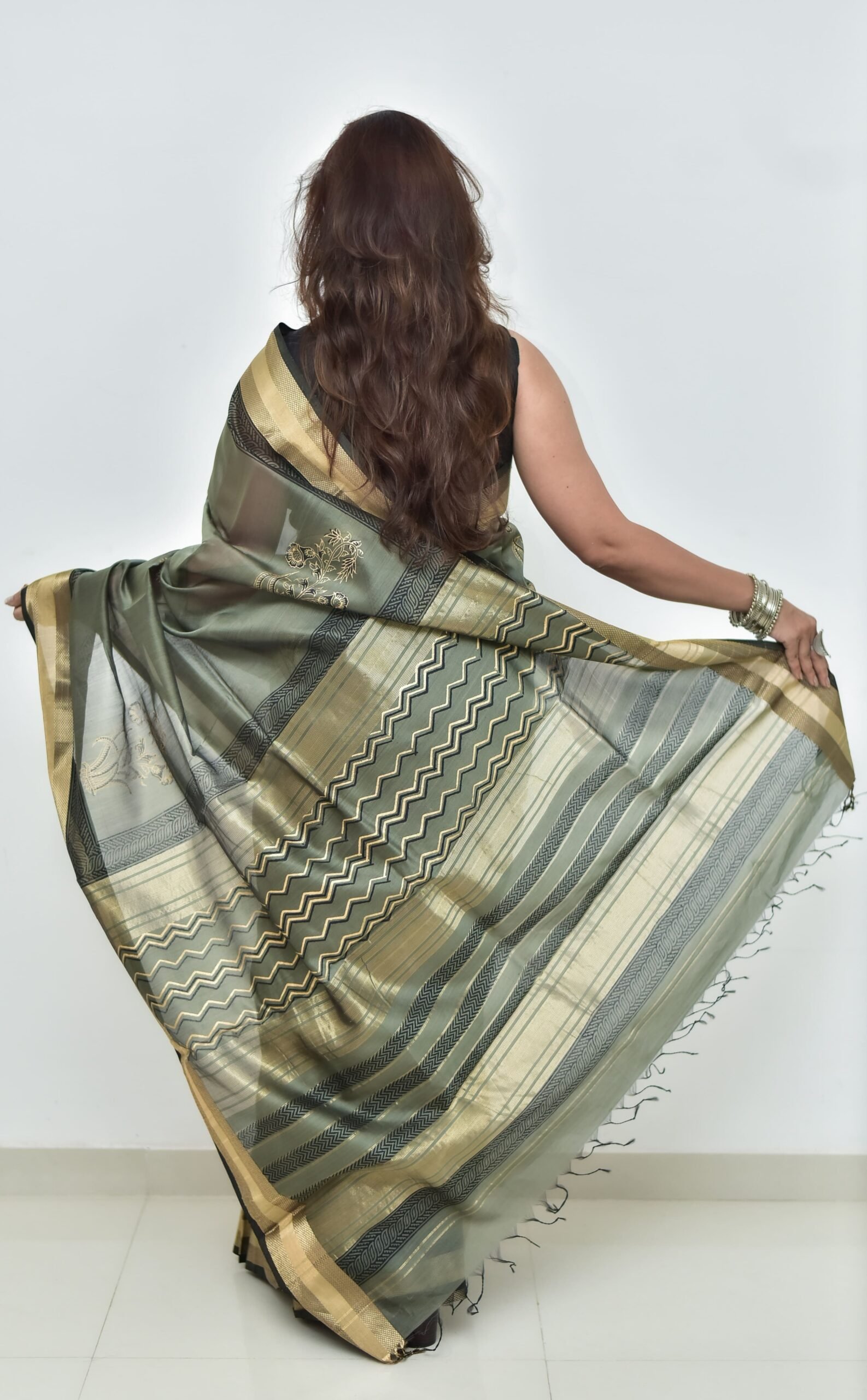 Steel Grey colour maheshwari handwoven Zari border saree with Gold and black handprint