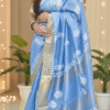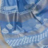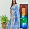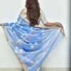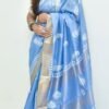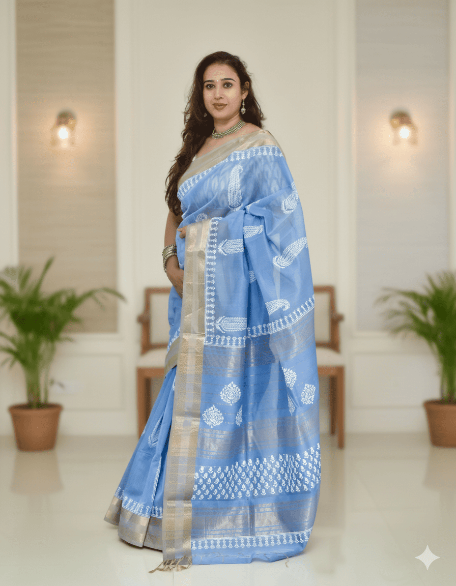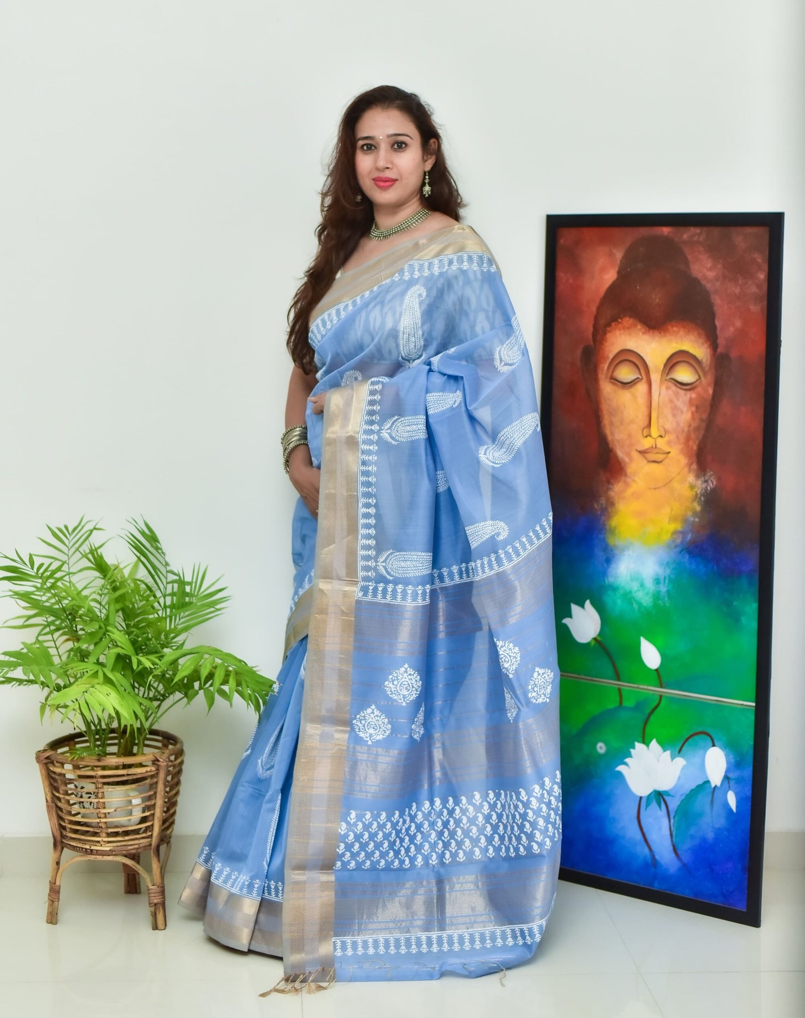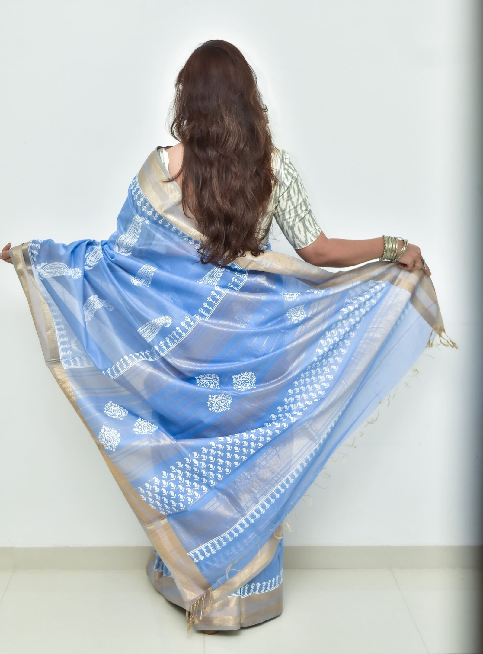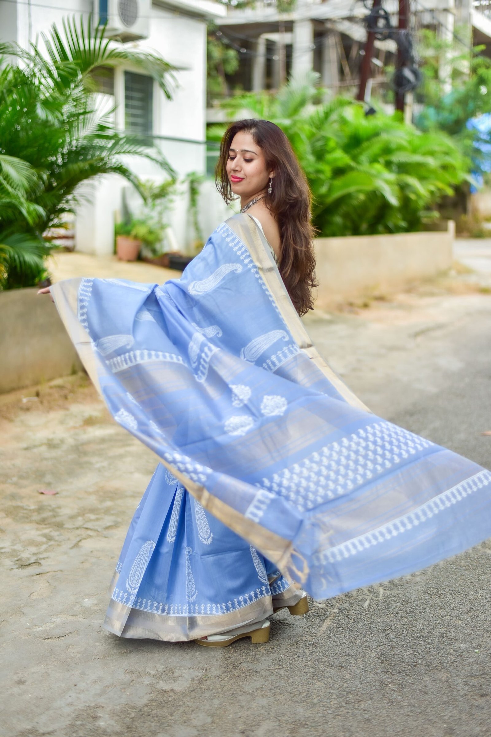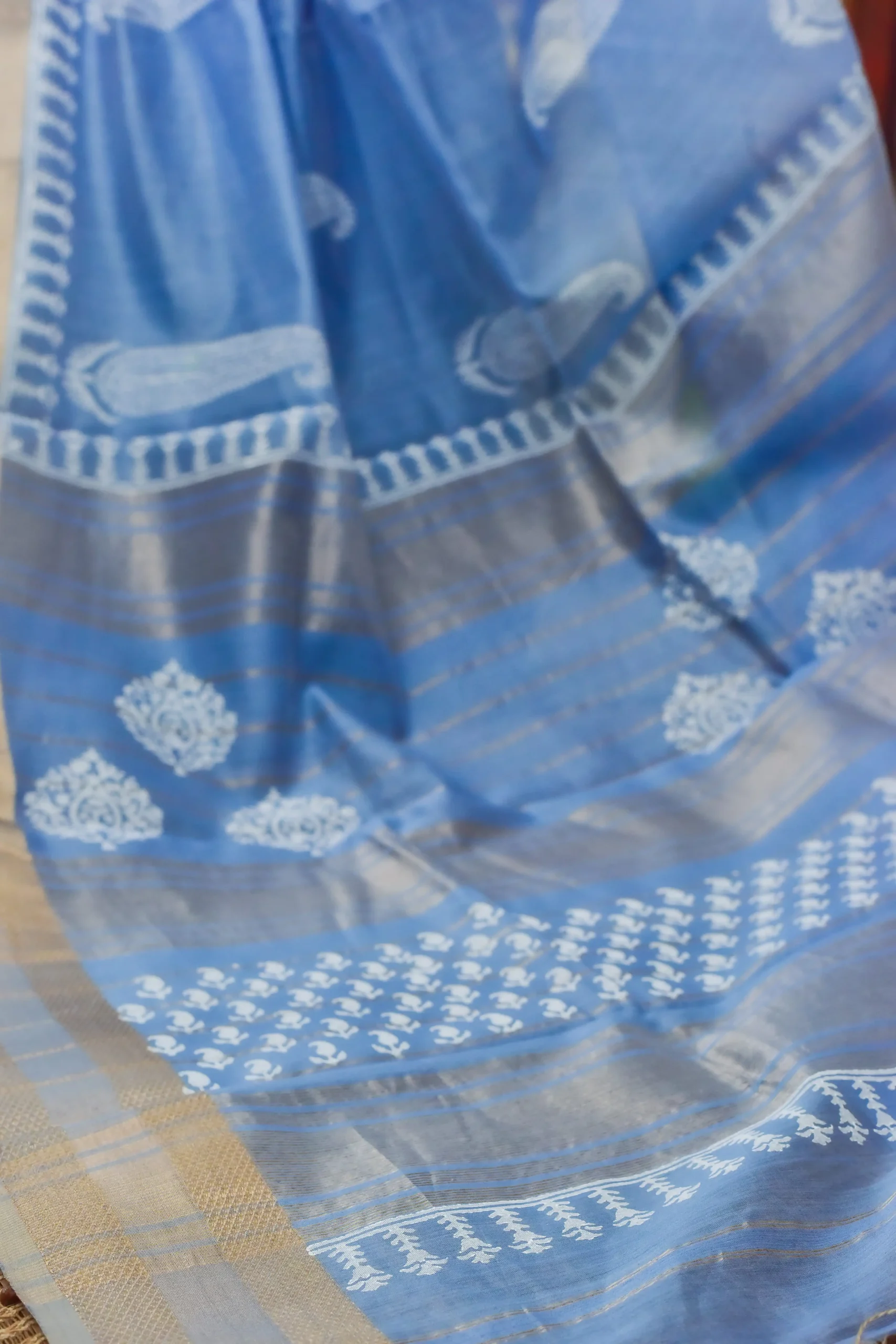 Powder Blue colour maheshwari handwoven Zari border saree with white Keri handprint
