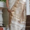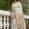 Offwhite colour maheshwari handwoven Zari and Resham border saree with white and gold handprint