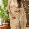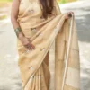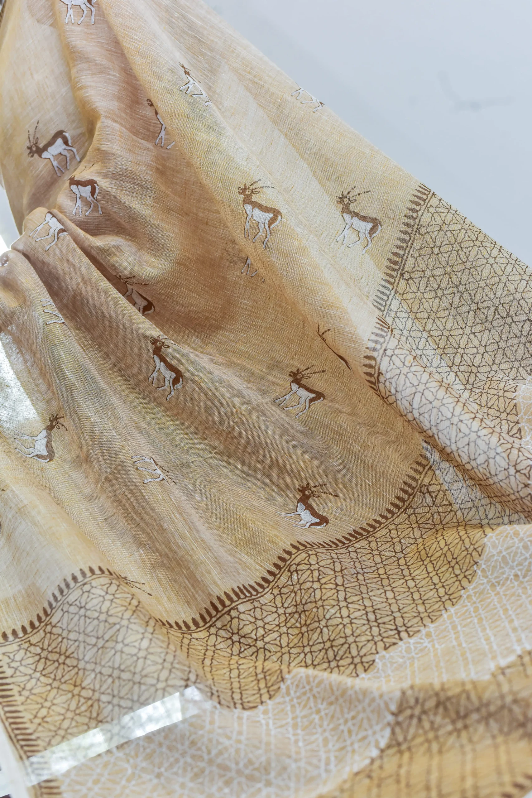 Khakhi linen by linen saree, handwoven saree with geometrical & blackbuck handprint